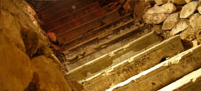 Vous posez le pied sur une marche et vous entendez soudain craquer la roche. In extremis vous levez le pied et déjà un morceau de la marche s'effrite et tombe dans un trou qui semble se trouver sous l'escalier. Pas de doute, ce lieu est des plus dangereux et d'aprés ce que vous pouvez distinguer, l'escalier ne tient que grace au fait qu'il est enfoncé dans les paroies droites et gauche. La partie située en dessous s'est écroulé depuis belle lurette et chaque pas risque de faire s'écrouler une marche à cause du poids. Prenant votre respiration, vous repartez et vous enjambez la marche qui s'est effondrée. Marchant sur la pointe des pieds avec l'impression que vous marchez sur des oeufs, vous dévaler lentement l'escalier jusqu'à ce que vous arriviez en bas. Là, une porte termine votre parcourt aprés avoir descendu une bonne centaines de marche. En tendant l'oreille, vous entendez le courant de l'eau qui semble passer derrière la porte