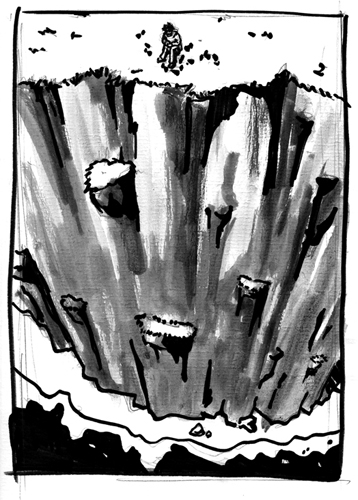 Vous vous approchez du précipice et contemplez en dessous la rivière qui coule en serpentant avec force, son courant entrainant avec lui tout ce qui se trouve sur son passage.