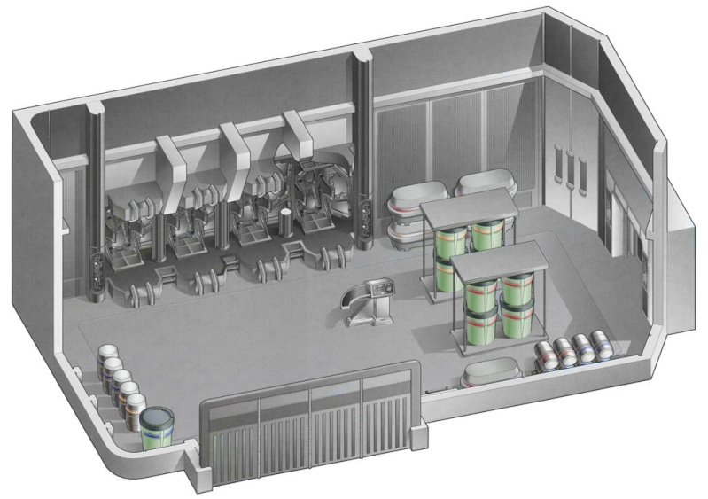 Vous vous matérialisez dans ce qu'on pourrait appeler une "alcôves", au milieu d’une salle d’environs 100m2. A votre gauche, il y a 3 autres alcôves identiques à la votre, placées contre un des murs ainsi que des caissons de matériel et des turbines d'energie située dans le fond de la piece.